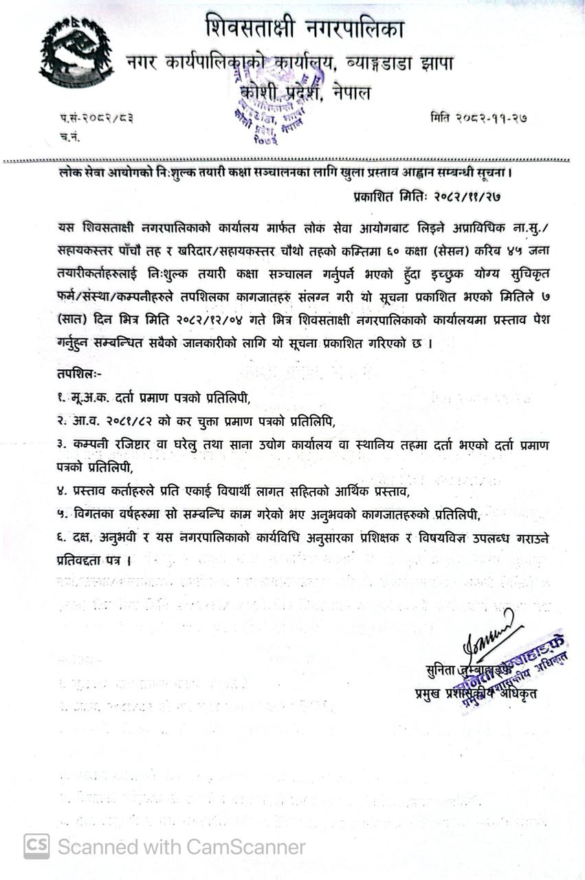लोक सेवा आयोगको नि:शुल्क तयारी कक्षा संचालन सम्बन्धि प्रस्ताव आव्हान सम्बन्धि सूचना ।