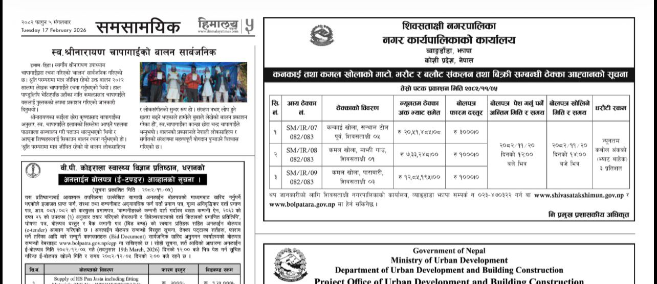 कनकाई र कमल खोलाको माटो भरौट र बलौट संकलन तथा बिक्री सम्बन्धी ठेक्का आवह्नको सूचना ।